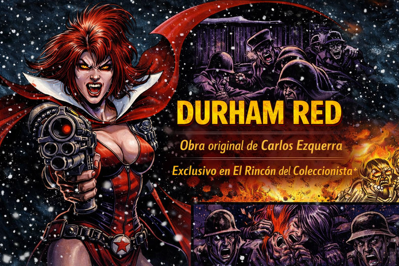 Durham Red es una de las figuras más icónicas y complejas del universo de 2000 AD, creada por Dan Abnett y Carlos Ezquerra. Vampiresa, mercenaria y superviviente, encarna una mezcla única de fuerza, sensualidad y tragedia, marcada por siglos de violencia y lucha por la redención.