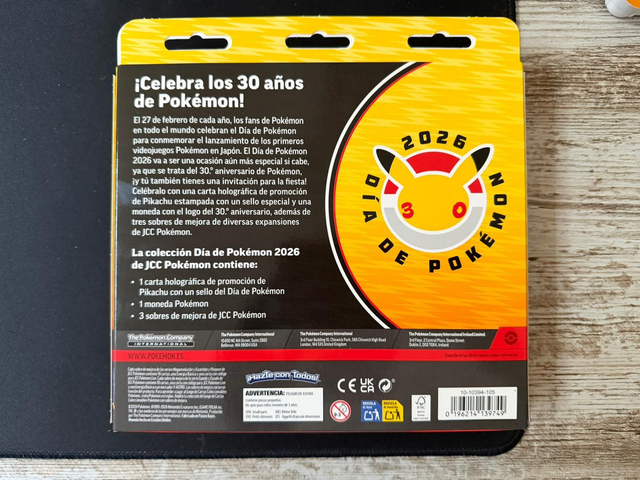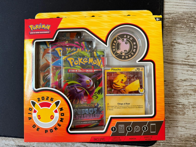 Este pack conmemorativo incluye una carta promocional de Pikachu, una moneda especial del aniversario y tres sobres oficiales en español, todo en formato nuevo y precintado.