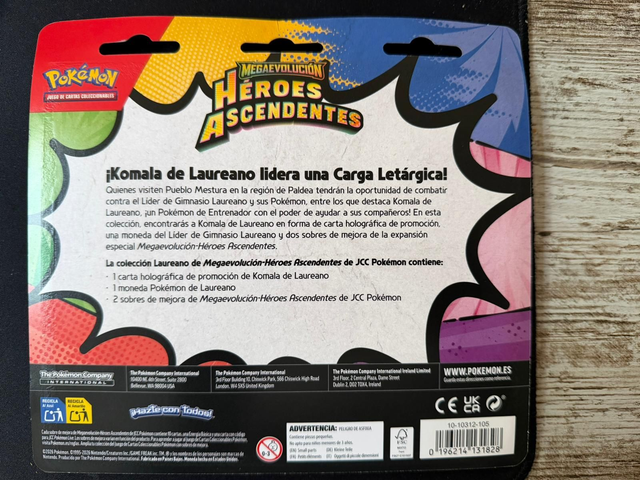 Se vende blíster oficial Pokémon de la colección Mega Evolución: Héroes Ascendentes, con carta promocional holográfica de Komala de Laureano, una pieza muy buscada por coleccionistas.