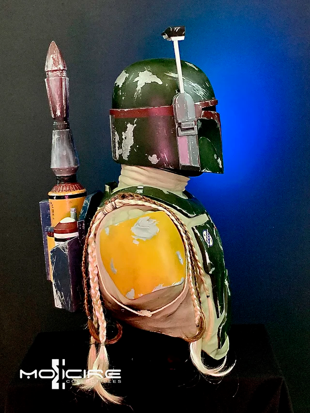 Imponente busto a escala real inspirado en el legendario cazarrecompensas mandaloriano. Esta pieza destaca por su acabado hiperrealista, con una armadura fielmente recreada que muestra desgaste, arañazos y marcas de batalla para un aspecto auténtico y vivido.