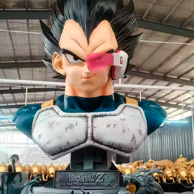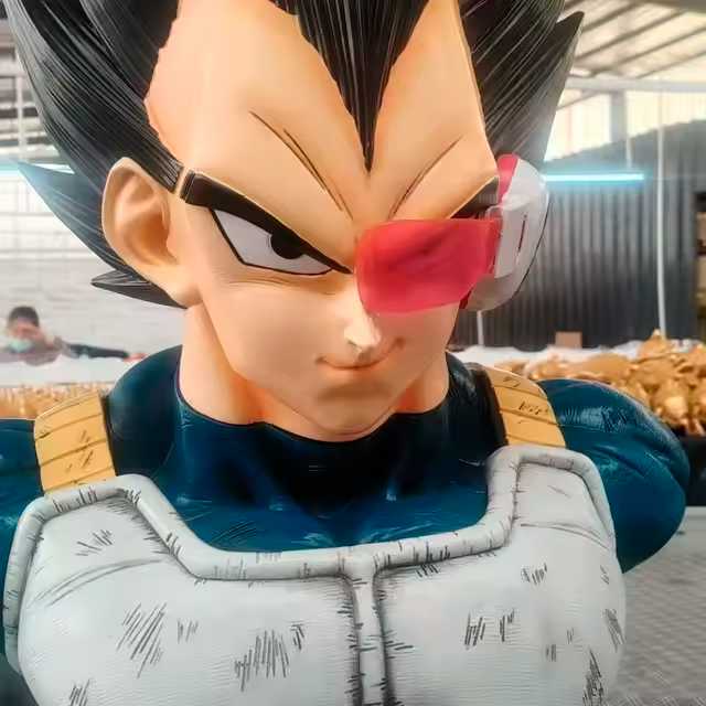 Impresionante figura de Vegeta a escala 1:1, diseñada como modelo decorativo con sistema de iluminación perimetral, ideal para fans y coleccionistas del universo Dragon Ball. Fabricada en resina, destaca por su presencia, acabado detallado y efecto visual gracias a la luz integrada, perfecta para escritorios, estanterías o vitrinas.