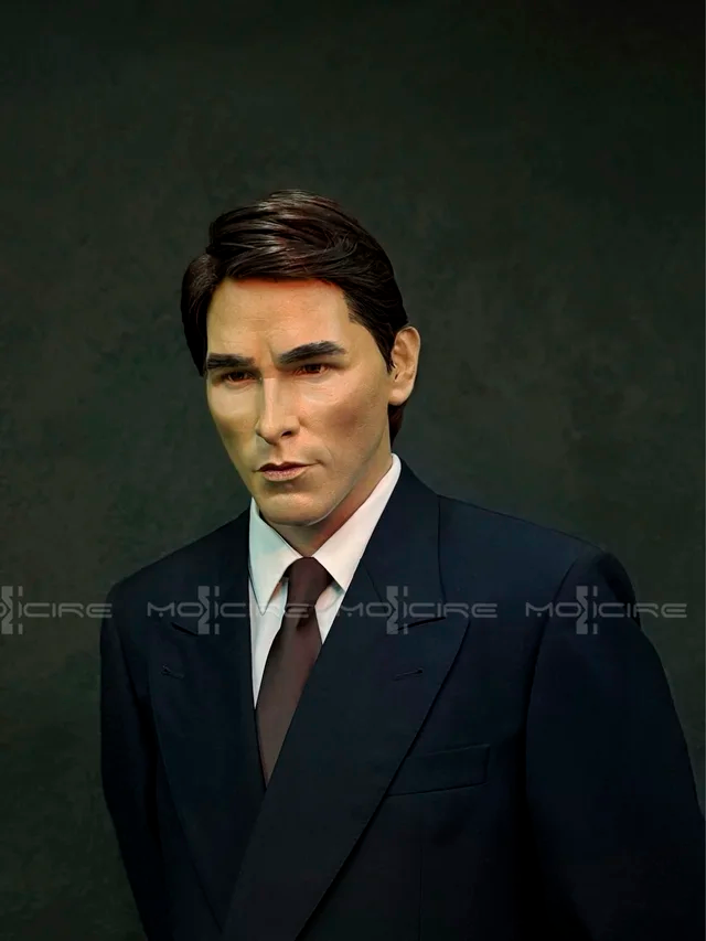 El rostro presenta un esculpido hiperrealista, con rasgos definidos y una expresión contenida que transmite inteligencia, control y carácter. El traje de corte clásico, cuidadosamente confeccionado, refleja elegancia y sobriedad, aportando un contraste perfecto entre sofisticación y poder. Cada detalle —desde la caída del tejido hasta la postura— ha sido trabajado para ofrecer una presencia realista y dominante.