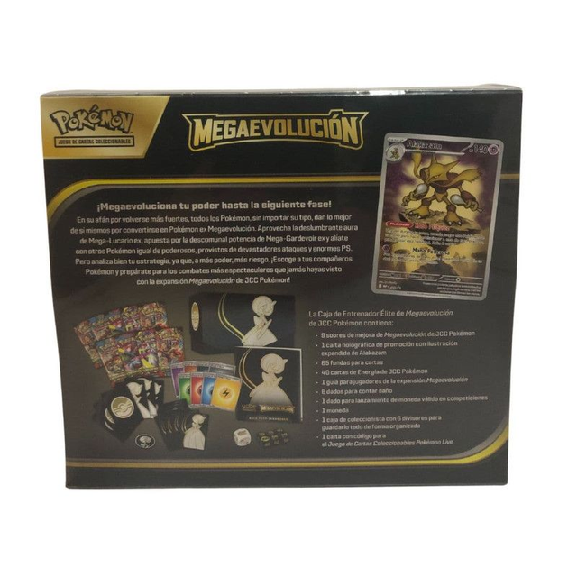 La caja contiene 9 sobres de mejora de la expansión Megaevolución, una carta promocional holográfica de ilustración completa, 65 fundas para cartas, cartas de Energía, una guía para jugadores, dados contadores de daño, un dado de lanzamiento de moneda válido para competiciones y una caja de coleccionista con divisores para mantener todo organizado. Además, incluye una carta con código para JCC Pokémon Live.