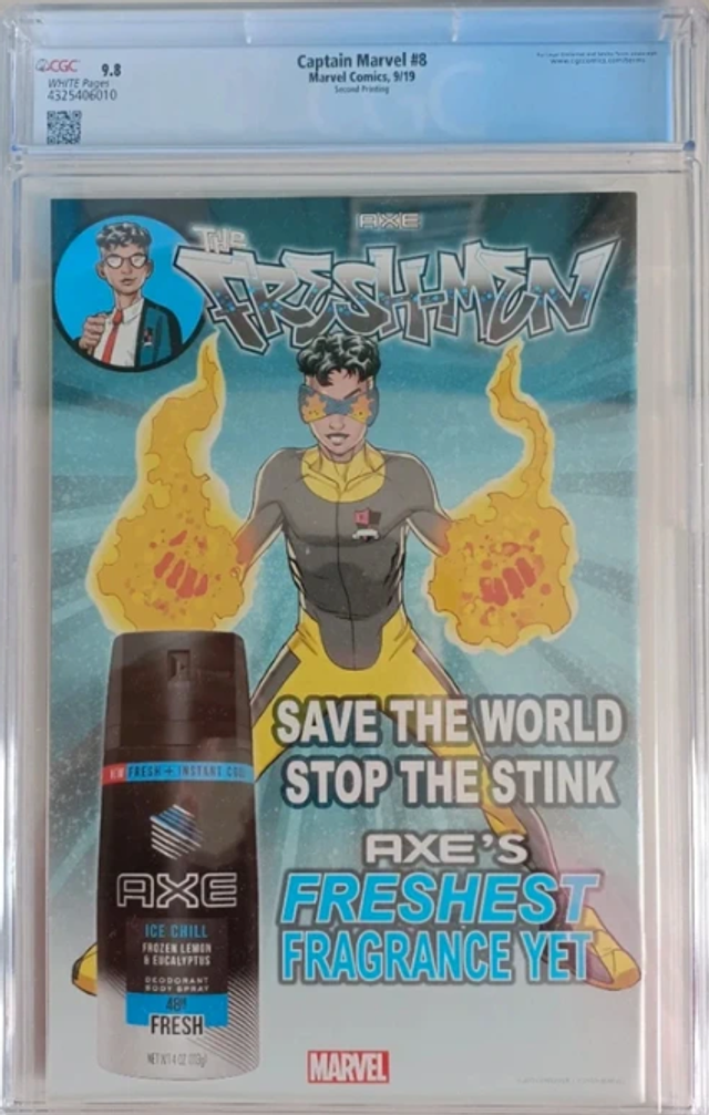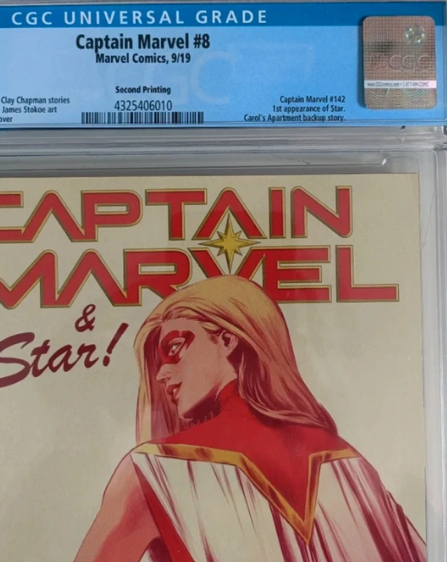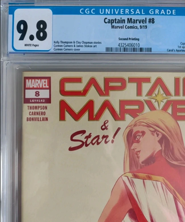 Ejemplar de gran interés para coleccionistas correspondiente a Captain Marvel #8, publicado por Marvel Comics en septiembre de 2019, encapsulado y certificado por CGC con una sobresaliente calificación 9.8 (Near Mint/Mint) y White Pages.