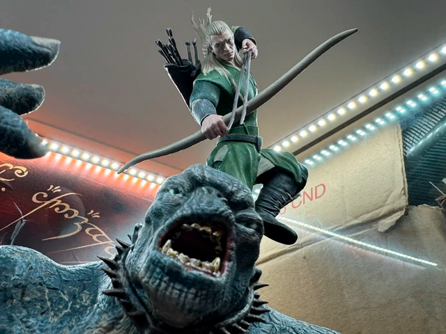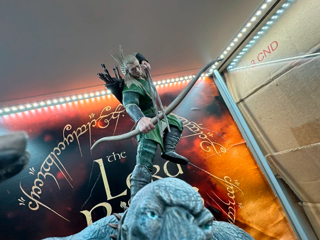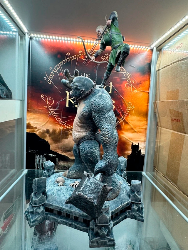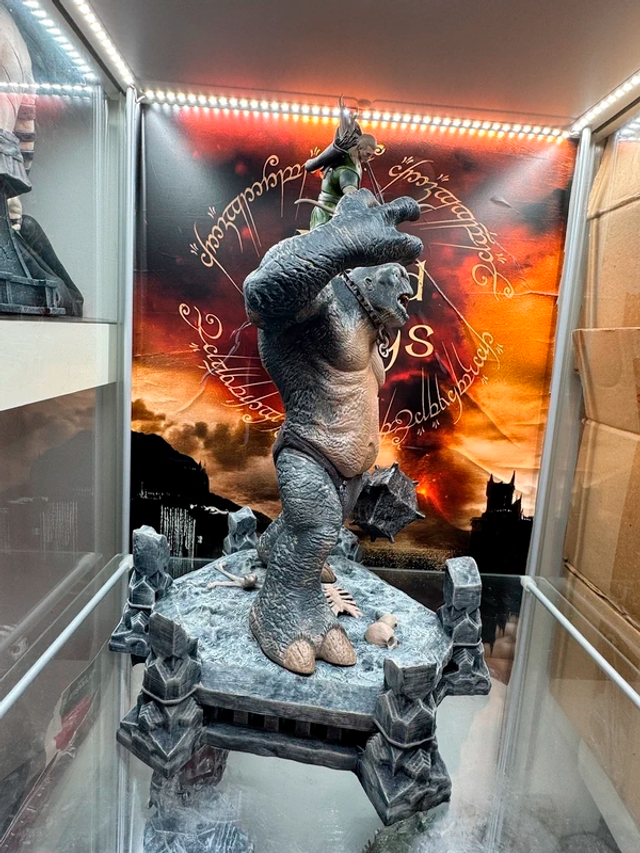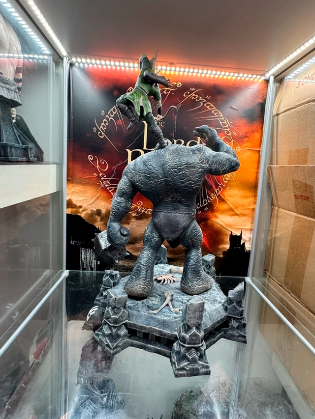 Espectacular diorama de El Señor de los Anillos que representa a un troll y a Legolas. Es una pieza única para coleccionistas. Fabricado en resina y pintado a mano y aerógrafo. Altura 36cm