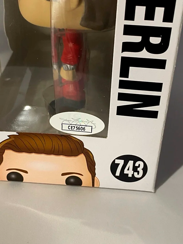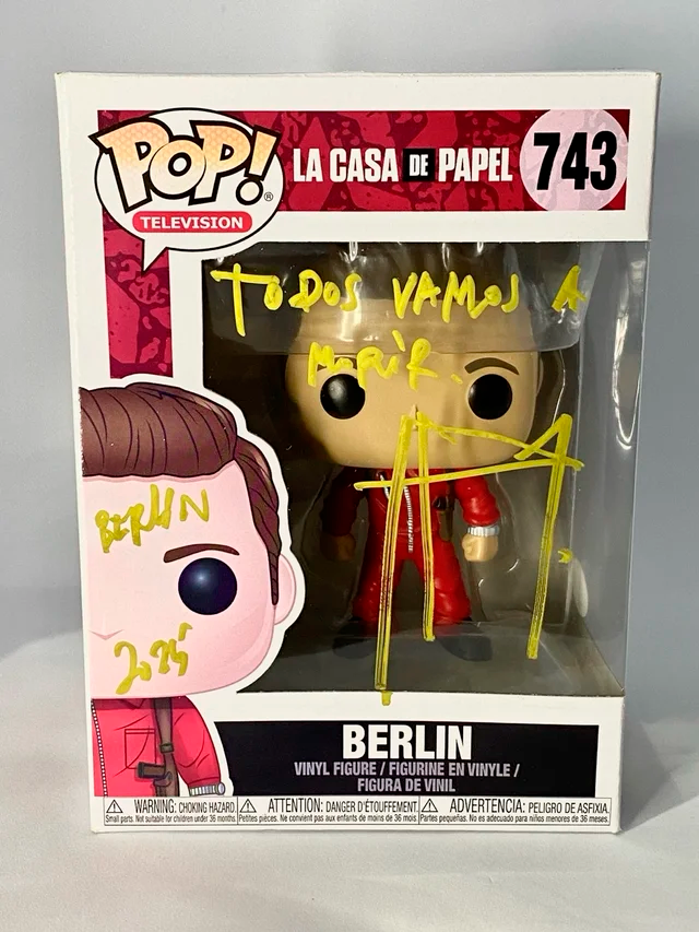 Figura Funko Pop! de Berlin de La Casa de Papel #743 firmada por Pedro Alonso, el actor que da vida a Berlin. Además, el actor escribio un dialogo suyo en la serie: "Todos Vamos a morir". La firma fue obtenida en la San Diego Comic Con de Malaga, el pasado septiembre de 2025, y con certificado de autenticidad de JSA, en la misma Comic Con.