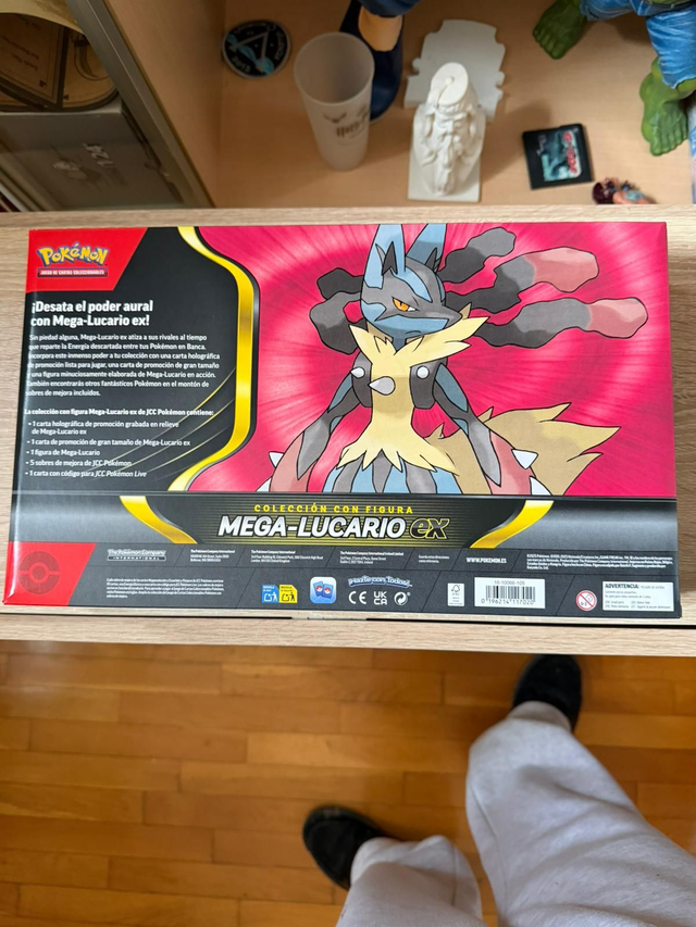 Incluye una carta holográfica promocional, una carta jumbo de gran tamaño, una figura exclusiva de Mega-Lucario, cinco sobres de mejora y un código para Pokémon TCG Live.