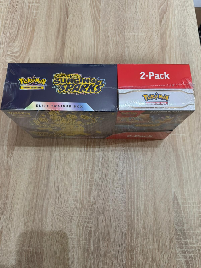 Consigue este exclusivo pack doble de Surging Sparks, que incluye una Elite Trainer Box con diseño especial de Pikachu y un Booster Bundle, todo en una sola caja sellada de fábrica.
