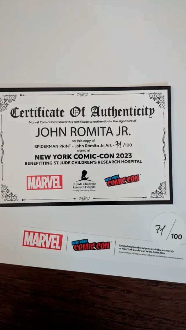 Esta impresión fue adquirida y firmada durante el New York Comic Con 2023, en un evento benéfico celebrado en el Artist Alley, cuyos beneficios fueron destinados al St. Jude Children’s Research Hospital. Incluye certificado de autenticidad oficial de Marvel, garantizando tanto la firma como la procedencia del artículo.