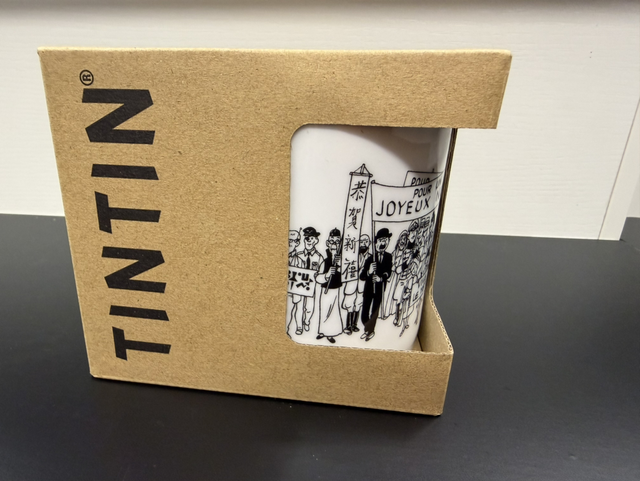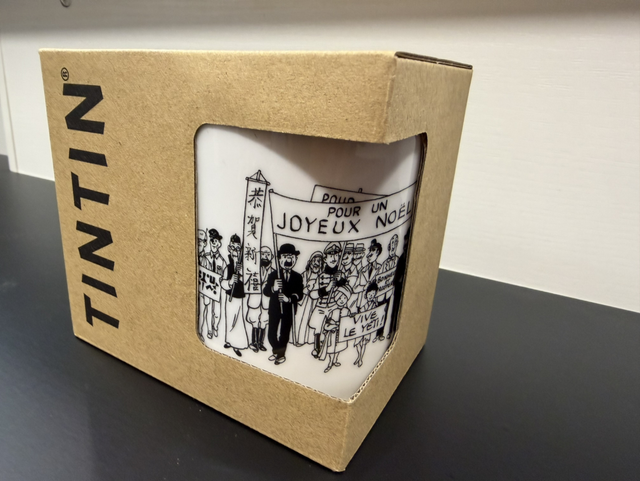 Taza de porcelana. La imagen de la taza corresponde a un fragmento de la larga postal de Navidad que dibujó Hergé en 1972. La ilustración de la taza comprende la parte de la postal que incluye a los principales personajes de Las aventuras de Tintín: el capitán Haddock, Néstor, Dupond, Dupont, el profesor Tornasol, Milú y, por supuesto, Tintín con la pancarta en favor de la paz.