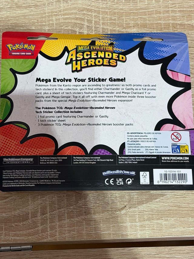 Descubre la Pokémon TCG Tech Sticker Collection: Mega Evolution Ascended Heroes, una colección especial ideal para jugadores y coleccionistas. Incluye una carta promocional foil de Charmander o Gastly, una hoja de pegatinas tech exclusivas y tres sobres de expansión Mega Evolution – Ascended Heroes para ampliar tu colección.